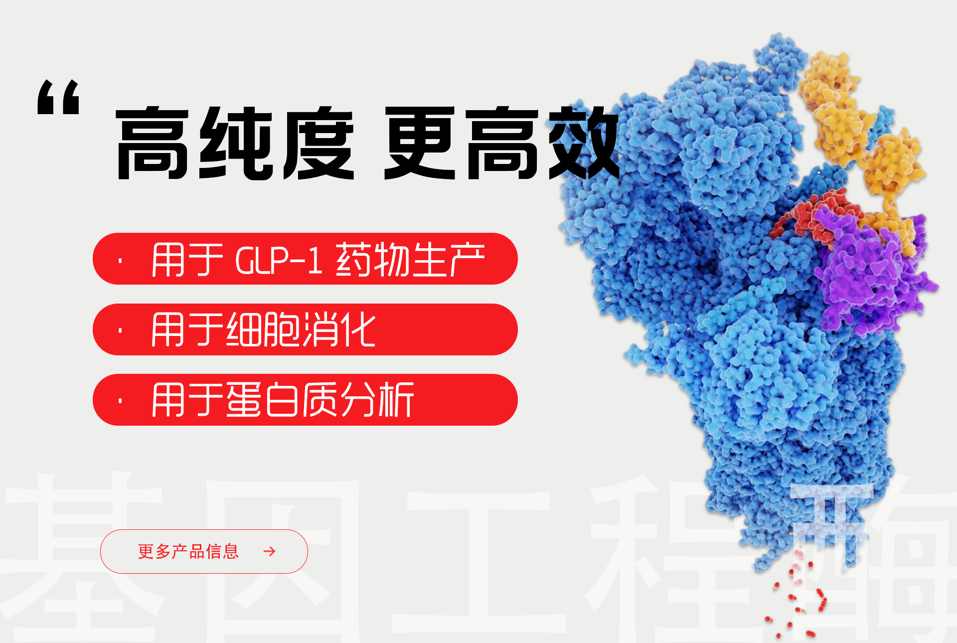 冀百康生物高活性基因工具酶類(lèi)原料具有消化快用量少,純度≥90%以上,活性高等特點(diǎn),廣泛應(yīng)用于抗體填料、細(xì)胞培養(yǎng)、細(xì)胞消化,酶切等應(yīng)用領(lǐng)域