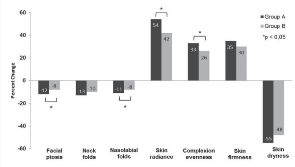 測(cè)試:一種固定配方的補(bǔ)償性護(hù)膚復(fù)合物(含3%的C-吡喃木糖苷衍生物Pro-xylane),在絕經(jīng)后女性中每日使用,60天后的效果。